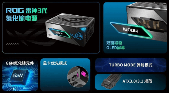 据了解,华硕ROG THOR 雷神3代电源采用了氮化镓GaN MOSFET技术,能够提供更高的电源效率和更精简的内部设计,并且实现了更低的运行温度。此外,该款电源还提供了新的显卡优先模式。