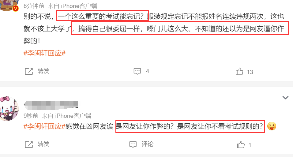 稍早前,李闽轩的母亲接受记者采访时,也坚决否认李闽轩作弊,并甩锅帮腔:如果她真的有作弊,当初学校老师为什么不给她叫停。李闽轩母亲还打了起来感情牌,称孩子被网暴,如今都不敢去上学了,言语间既气愤又心疼。