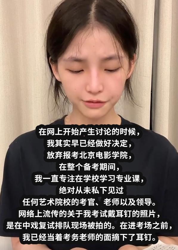 李闽轩还表示看到网上闹得这么凶,自己早就准备放弃报道北电。并表示在备考期间,自己一直在努力学习专业课,绝对没私下见过任何考官。网传戴耳钉的照片,是中戏复试现场被拍的,进考场前,她已经摘下了。