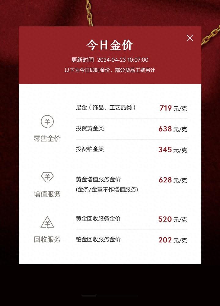 国内金价同样迎来回调,今天,多家珠宝品牌零售金价均下调14元左右,如周大福、曼卡龙等品牌,昨天挂牌为733元/克,今天已调整至719元/克。