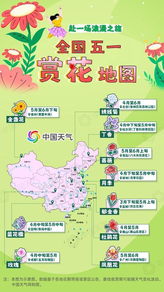 4月接近尾声,我国北方大部地区都已经进入气象学意义上的春季,各地洋溢着春天的活力,丁香、月季、绣线菊、蔷薇、金盏花等陆续进入最佳观赏期。今年五一假期,北方晴朗天气居多,气温总体较舒适,正是踏青赏花的好时节。