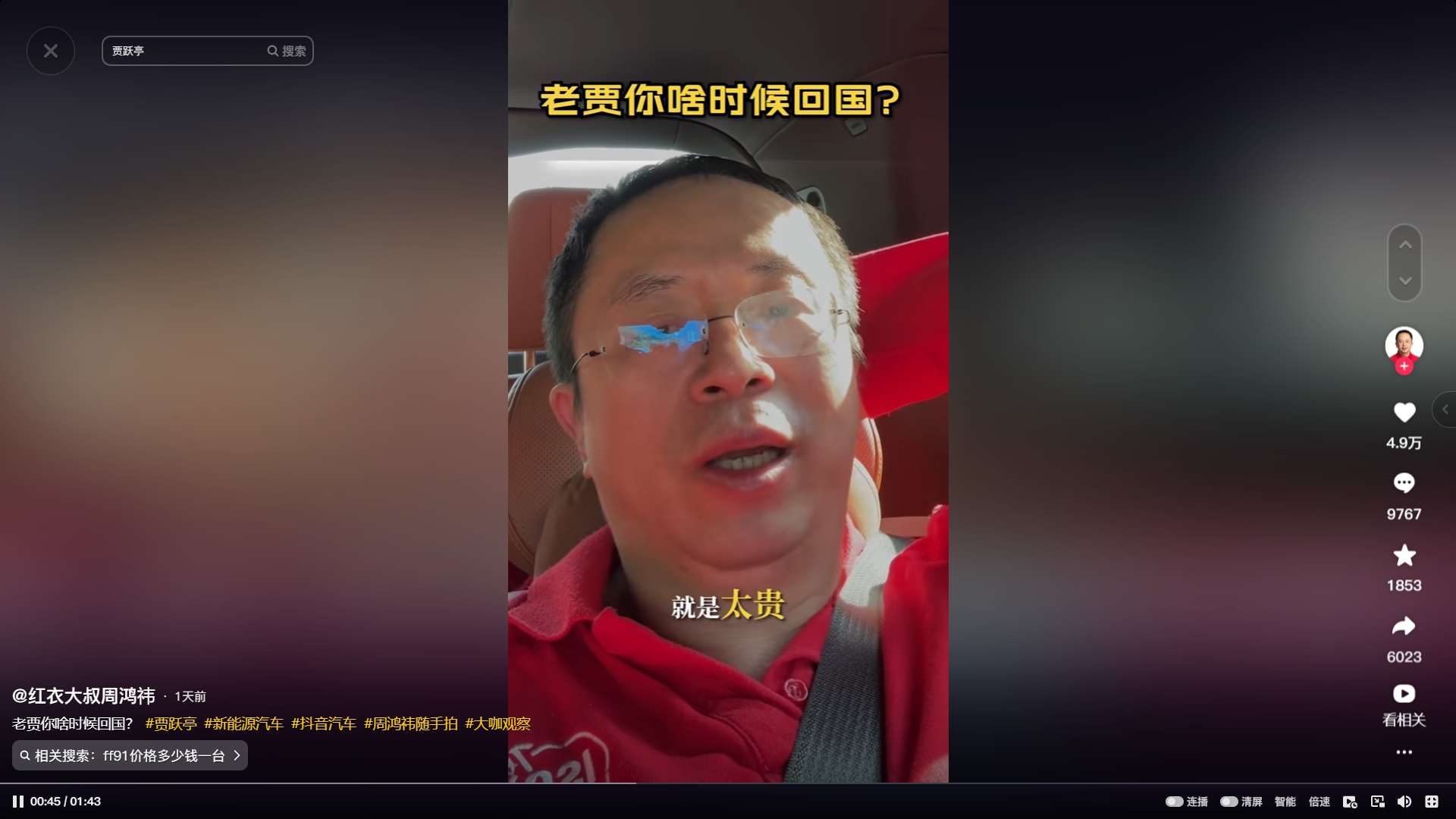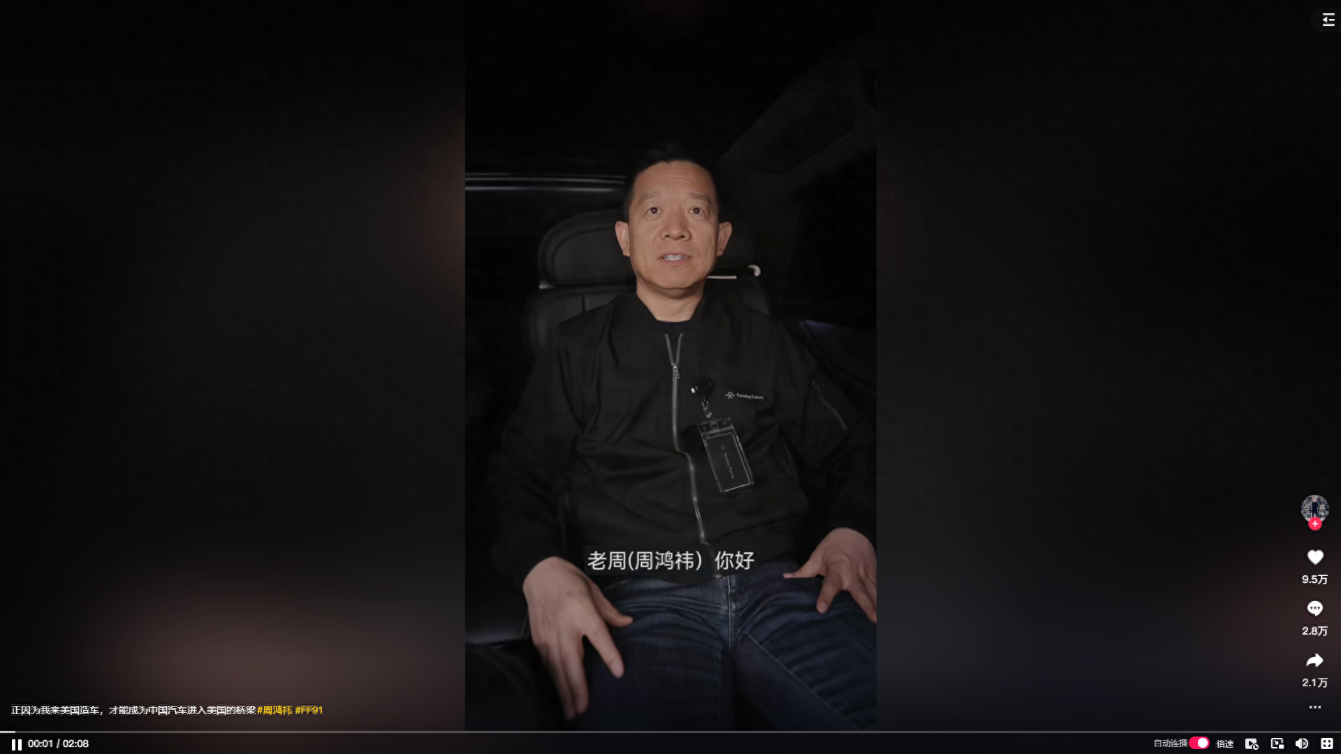 2024年4月24号,贾跃亭在美国发视频隔空喊话周鸿祎:老周(周鸿祎)你好,我现在正坐在FF91的后排,而这台车也正是从后排开始定义的。我们的零重力座椅和智能后排互联网系统,无论是工作还是生活都绝对是你最需要的。下次你在美国的时候,希望FF91能成为你的专属座驾。 我和老周也是十几年前智能手机时代相杀相爱的老相识了,没想到在汽车上又有了交集。 这两天我听到了老周对我们的一些评论,但我认为为盗窃者鼓噪不应该是老周的价值观。我也认为老周希望向年轻的奋斗者传递和倡导的不应该是抄袭和山寨。 我也相信老周你也一定认同,只有原创精神深入骨髓,大量的原创奋斗者涌现,才能推动中国AI电车产业占立在世界之巅。 FF从量产以来,虽然只交付了11台车,但这些经历了无数磨难才诞生的11台车是完全原创创新的塔尖产品,具备非凡的颠覆性的意义。 也正是因为10年前我来到美国造车,我们才有了能力成为中国汽车进入美国市场的重要桥梁。 中国目前具备了全球最强的供应链,但只有放在全球一体化的经济体系里才能进发出最大的价值。FF的供应链正在努力向中国转移,我们也会在合适的时机把FF91带回到中国制造。 就像我昨天在汽车峰会上说的一样,原创和变革是FF的信仰。我也坚信,我也坚信唯有原创创新才能让中国的AI电车走向欧美。 如有需要,我们愿意帮助包括老周你投资的哪吒汽车在内的所有AI电车企业,从产品定义AI技术平台品牌营销及发布销售和用户生态构建等5个方面,全面提升决胜五力,助力大家在美国及全球市场取得成功。