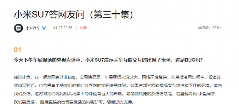 4月27日晚间,小米汽车官方微博发布了答网友问(第三十集),这集里共回应了6个问题,特别是当天不少人关注的央视直播时小米SU7演示手车互联交互卡顿。