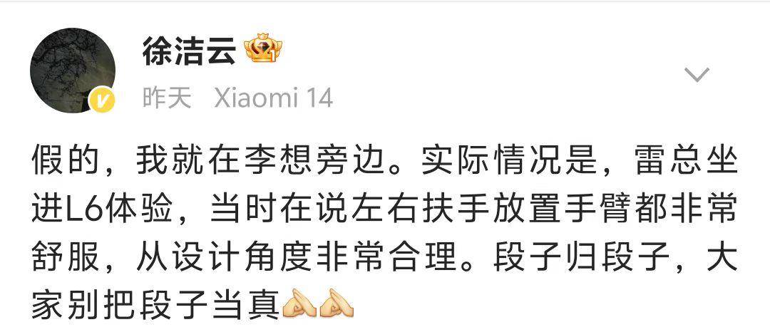 4月27日,小米高管徐洁云在社交媒体转发“真的假的,雷总昨天坐理想L6本意是坐一下就想开门走,李想把门关上了”的帖子并辟谣:假的,我就在李想旁边。实际情况是,雷总坐进L6体验,当时在说左右扶手放置手臂都非常舒服,从设计角度非常合理。段子归段子,大家别把段子当真。