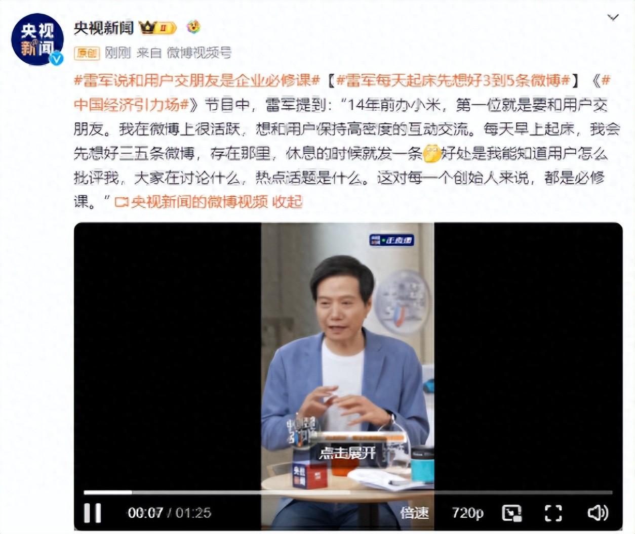 转载: 2024-04-28 17:36·长城网 《中国经济引力场》节目中,雷军提到:“14年前办小米,第一位就是要和用户交朋友。我在微博上很活跃,想和用户保持高密度的互动交流。每天早上起床,我会先想好三五条微博,存在那里,休息的时候就发一条。好处是我能知道用户怎么批评我,大家在讨论什么,热点话题是什么。这对每一个创始人来说,都是必修课。”来源:@央视新闻