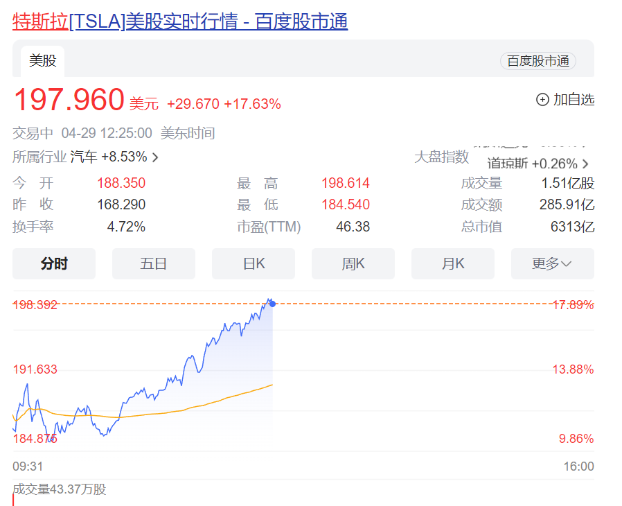 4月29日,特斯拉开盘就暴涨。截至完稿,特斯拉股价报197.96美元,涨超17%,总市值6313亿美元,较前一个交易日暴增近946亿美元(约合人民币6840亿元)。