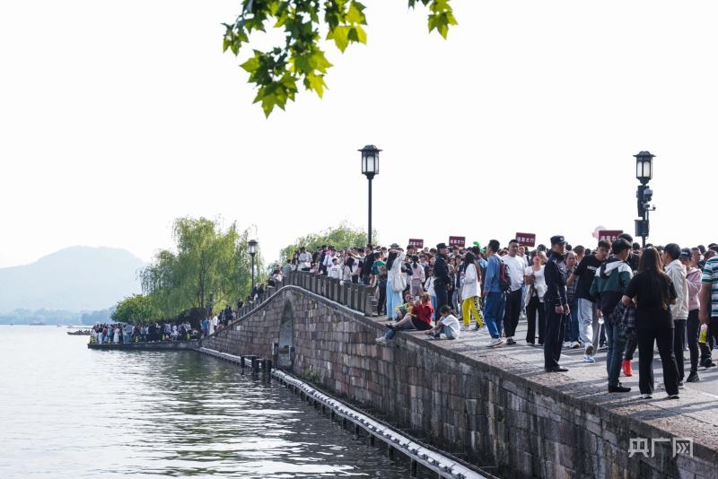 “五一”小长假首日,西湖断桥上游客摩肩接踵(央广网记者 尚天宇 摄)
