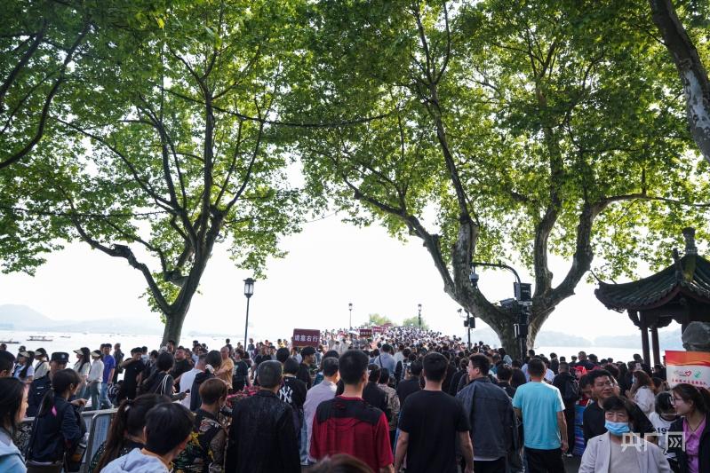 西湖白堤“人从众”一眼望不到头(央广网记者 尚天宇 摄)