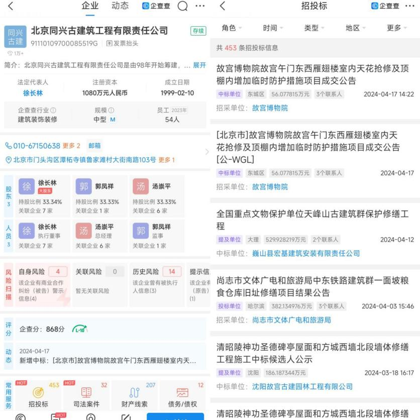 企查查信息显示,北京同兴古建筑工程有限责任公司成立于1999年,法定代表人为徐长林。招投标信息显示,该公司先后中标全国多地文保单位修缮工程,其中包含故宫博物院、全国重点文保单位天峰山古建筑群、原齐鲁大学近现代建筑群等。