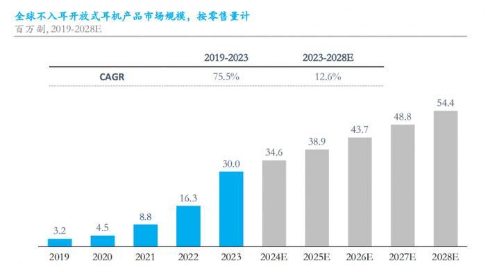 不过,尽管对开放式耳机的评价褒贬不一,但这类耳机还是成功在耳机市场占据了一席之地。根据权威增长咨询公司Frost&Sullivan发布的《全球不入耳开放式耳机行业独立市场研究报告》报告,2019年至2023年期间,全球不入耳开放式耳机的整体市场规模几乎翻了十倍,年复合增长率高达75.5%。报告预计,2023到2028年间,这类耳机的销量或能达到5440万。