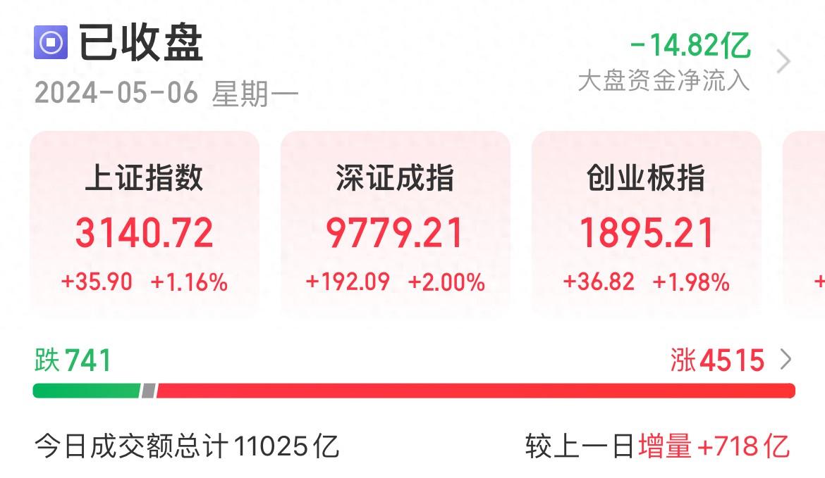 5月6日的A股行情并未让股民们失望。截止收盘,沪指涨1.16%,深证成指涨2%,创业板指涨1.98%,北证50指数涨1.43%,沪深京三市成交额11074亿元,其中沪深两市11025亿元,较上日放量718亿元。