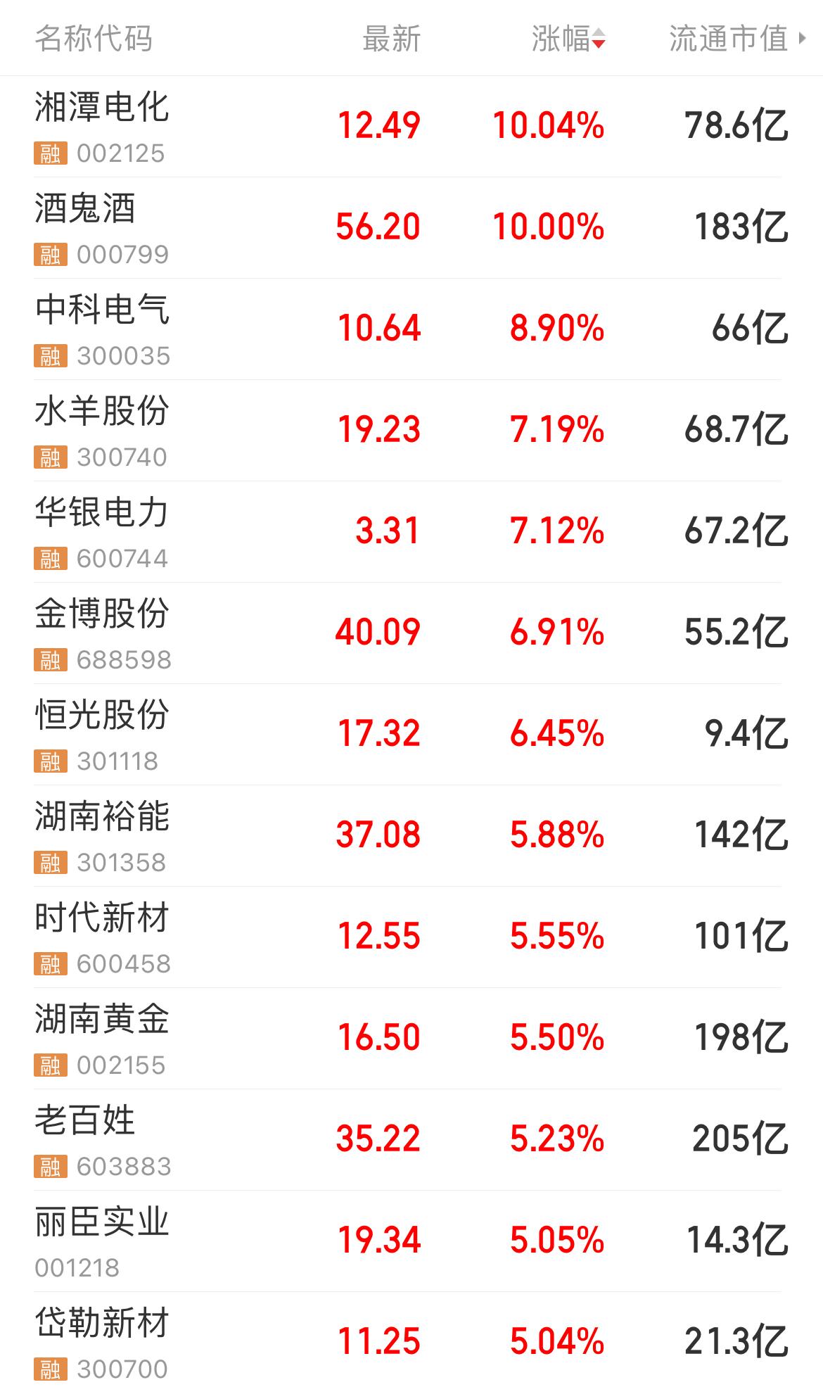 湘股方面,共有114家录得上涨。其中,湘潭电化、酒鬼酒涨停;中科电气大涨超8%,水羊股份、华银电力大涨超7%,金博股份、恒光股份涨超6%,另外还有湖南裕能、时代新材、湖南黄金、老百姓、岱勒新材等多股涨超5%。