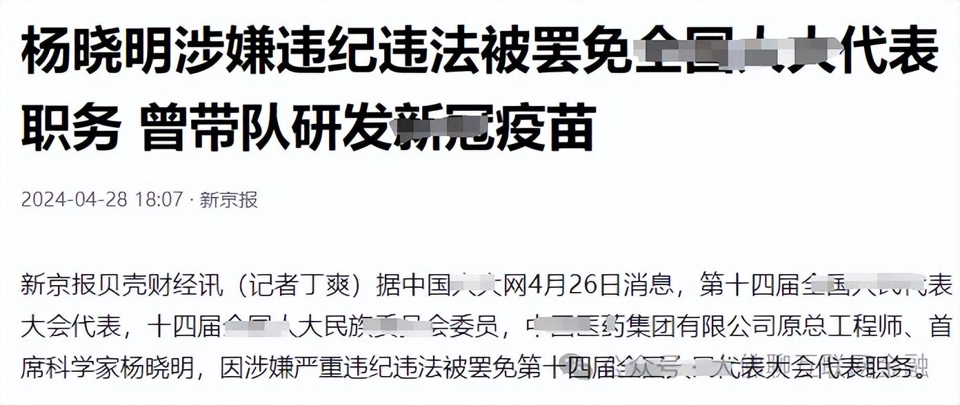 最近有报道称,“某冠疫苗之父”杨晓明被查。