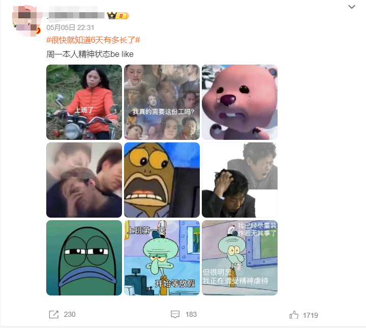 不出意料,五一假期后上班第一天,“节后上班第1天”“很快就知道6天有多长了”“上班”“这个周六需要上班”“延长五一的方法”,多个“复工”相关词条登上热搜。