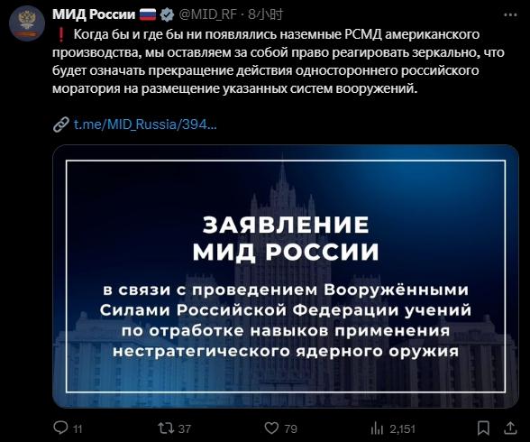 声明提到,近一段时间,美西方国家持续援乌武器并公开宣布支持乌克兰袭击俄领土的“恐怖主义行为”,包括英法提供的远程导弹、美国提供的可以打击俄领土的ATACMS系列导弹,“对俄罗斯国家安全构成额外威胁”。美国还通过在世界各地部署中程陆基导弹系统,增加了对俄罗斯的“多方面导弹威胁”。
