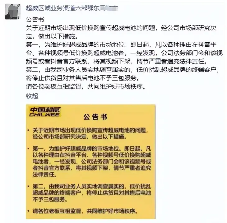 近日,天能电池在官方通知中明确表示,将严查低价宣传和销售行为,对于违规者将采取严厉措施,包括不予供货、收回货品,甚至不提供售后服务。超威电池也紧随其后,发布了类似的公告。两大巨头的联手,无疑给那些挂羊头卖狗肉的来了狠狠地一记耳光!