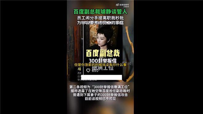 今日百度副总裁璩静短视频言论在网络持续发酵。“百度副总裁称员工闹分手提离职我秒批”一词登上了微博热搜,据了解,该言论出自于璩静的抖音账号,这个账号一共发布了4条视频。截至发稿,她的抖音账号视频已全部删除。