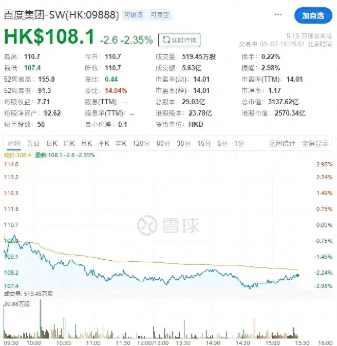 凤凰网科技讯 5月7日,百度港股今日股价下跌,截至发稿,百度股价下跌2.35%,报108.1港元,市值蒸发超60亿港元。