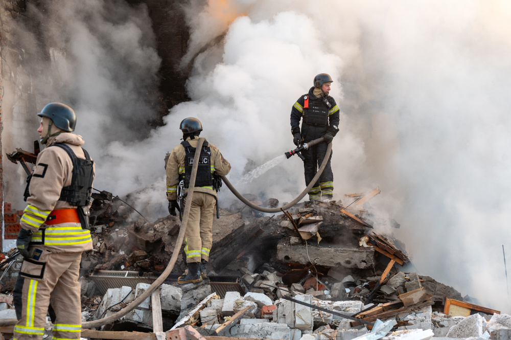 当地时间2024年5月10日,乌克兰哈尔科夫,导弹袭击后,消防员在爆炸现场灭火。 视觉中国 图