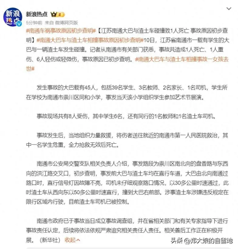 另外,拉学生的这个大巴司机真的很不负责任,明明在另一条路上有汽车和电动车在通行,他都没有看到吗?如果他能及时看到的话,这个悲剧也就能避免了。虽然通报中说的是渣土车出现在了限行区域,但是我想说的是如果是普通的家用SUV呢,那要是出现同样的车祸的话,责任怎么划分呢?