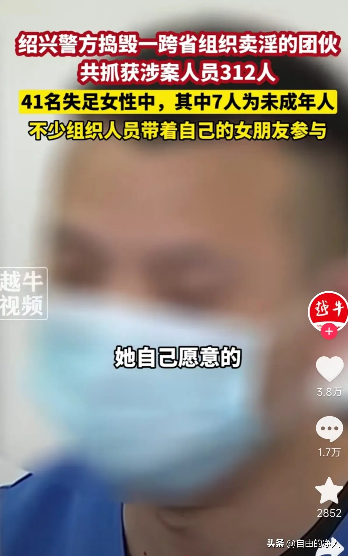 5月1日,来自媒体的消息称,绍兴一大型卖淫团伙被警方摧毁,共计抓获涉案人员312人,在41名失足女性中,其中有7人为未成年,最小的只有14周岁,查证涉案非法获利1200多万元。