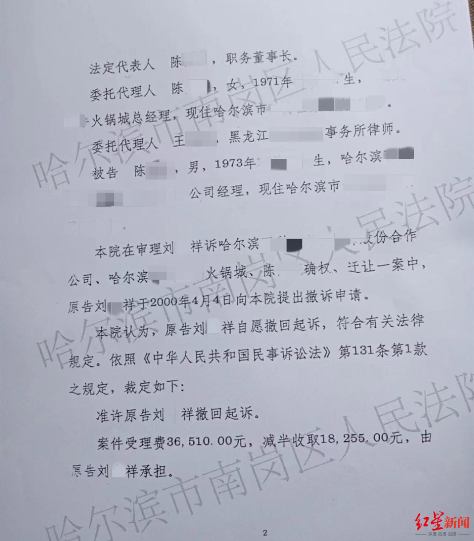 对于这次撤诉,邢女士表示,法院审理中提出对此案调解,当时的调解方案是让陈某的公司退给刘某祥450万元,火锅城则由二外甥陈某继续经营。刘某祥认可该调解方案,在刘某祥姐姐介入下,刘某祥提出撤诉。不过该案撤诉后,陈家并未支付款项。