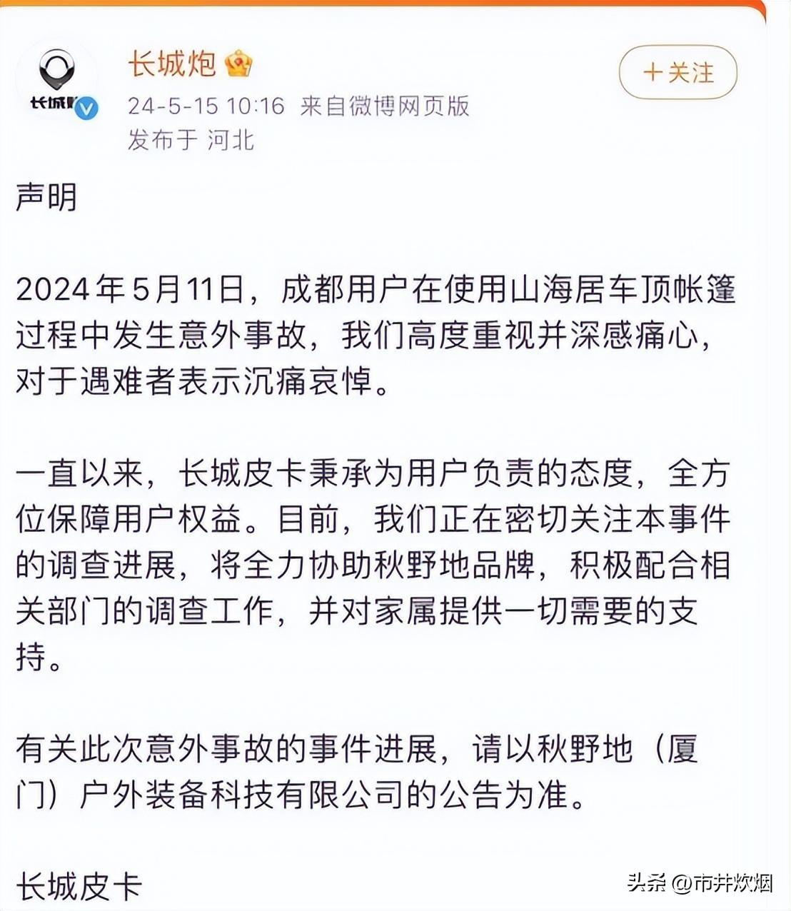 在这起意外中,涉事车辆是一款配备有双层电动帐篷的长城炮越野车。据了解,这款电动帐篷由“秋野地”公司研发,采用了先进的遥控升降系统,搭配可拆式电源,为车友们提供了便捷舒适的户外生活体验。然而,正是这样一款看似完美的产品,却在这场意外中暴露出了致命的缺陷。