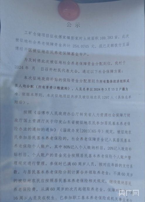 3月16日,淄博经开区傅家镇彭家村党务村务公开栏里张贴出一份公示,核心内容是,村里的169.383亩集体土地被征收,共涉及被征地农民1297人;被征地社会养老保障资金已拨付经开区专用账户,村委会将召开村民代表大会,通过拟定的社会保障方案。