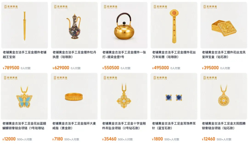 在老铺旗舰店,一个花丝蓝翅蝴蝶锁骨链,定价12000元,一个玫瑰花窗吊坠,售价19680元,一个三圈福珠手串,售价43980元。还有售价271000元的金鸳鸯、550500元的金壶、789500元的越王宝剑足金摆件……