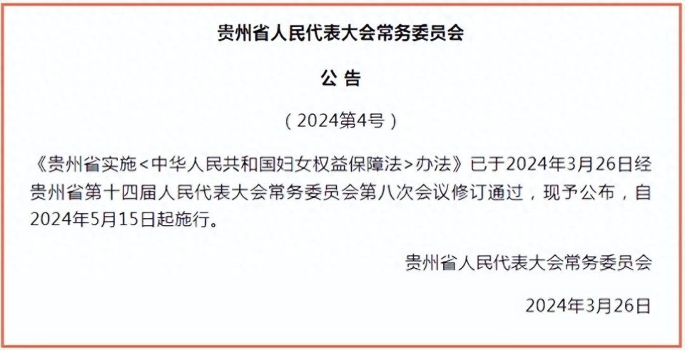 自2024年5月15日起《贵州省实施<中华人民共和国妇女权益保障法>办法》施行!