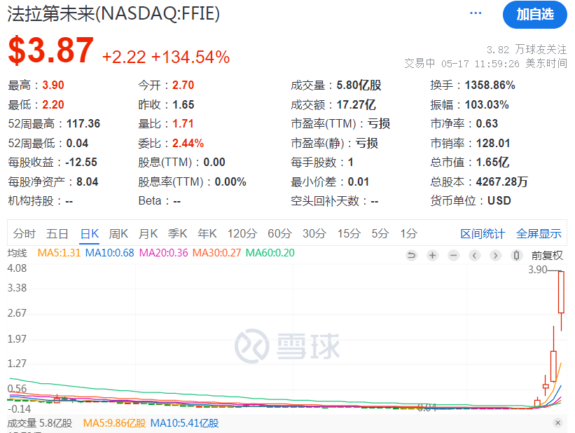 再看看另一只跟中国背景有关的公司,贾跃亭的法拉第未来,短短一周交易日,暴涨了近100倍!
