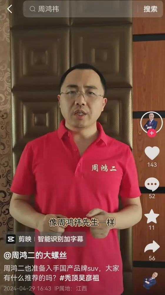 值得一提的是,除了“雷民”之外,还有一位自称为“周鸿二的大螺丝”的博主,他则选择了模仿另一位知名企业家周鸿祎。从穿搭、镜头角度到语气、坐姿、手势,他都努力向周鸿祎靠拢,试图通过模仿来获取关注度。