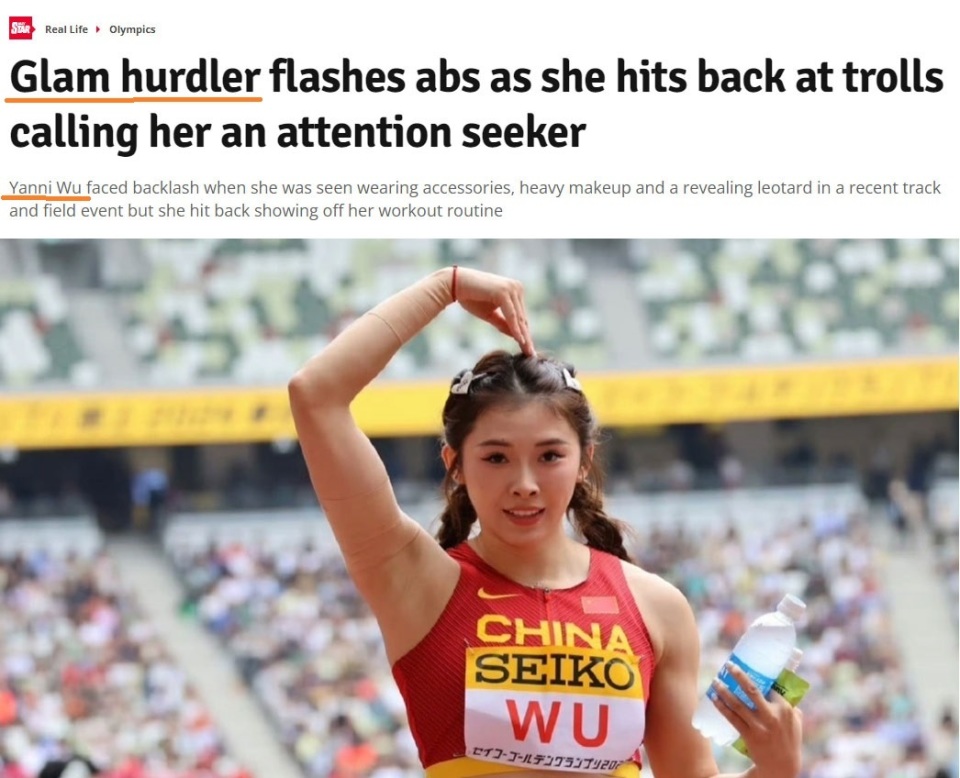 《迷人的跨栏运动员展示腹肌,回击那些称她为博眼球的批评者》,报纸并给出了这样的标题,同时在附文中解释称,“吴燕妮在最近的一次田径比赛中因佩戴首饰、浓妆艳抹,并且穿着过分的紧身衣而遭到强烈反对,但她用自己的训练来予以回击。”