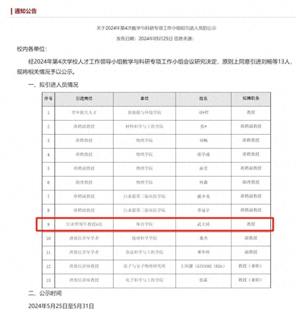 5月25日,吉林大学人才工作办公室发布《关于2024年第4次教学与科研专项工作小组拟引进人员的公示》。其中,武大靖拟聘为吉林大学体育学院教授,定为匡亚明领军教授A岗。
