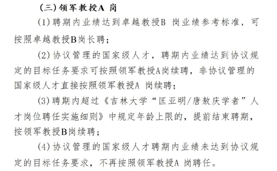 领军教授A岗的受聘条款显示,协议管理的国家级人才,聘期内业绩达到协议规定的目标任务要求可按照领军教授A岗续聘,业绩未达到协议规定的目标任务要求,不再按照领军教授A岗聘任。