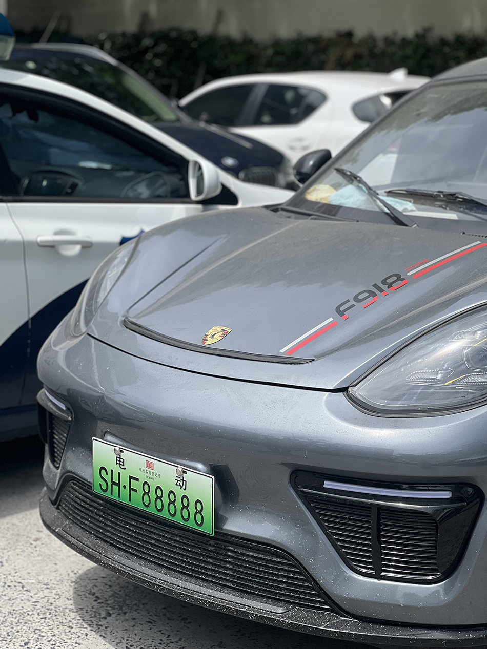 在采访中记者发现,该车辆前面悬挂着保时捷的品牌标志,车后箱的玻璃中又印着“FARRERI”,但实际肉眼观察到的大小比普通轿车要小一圈。