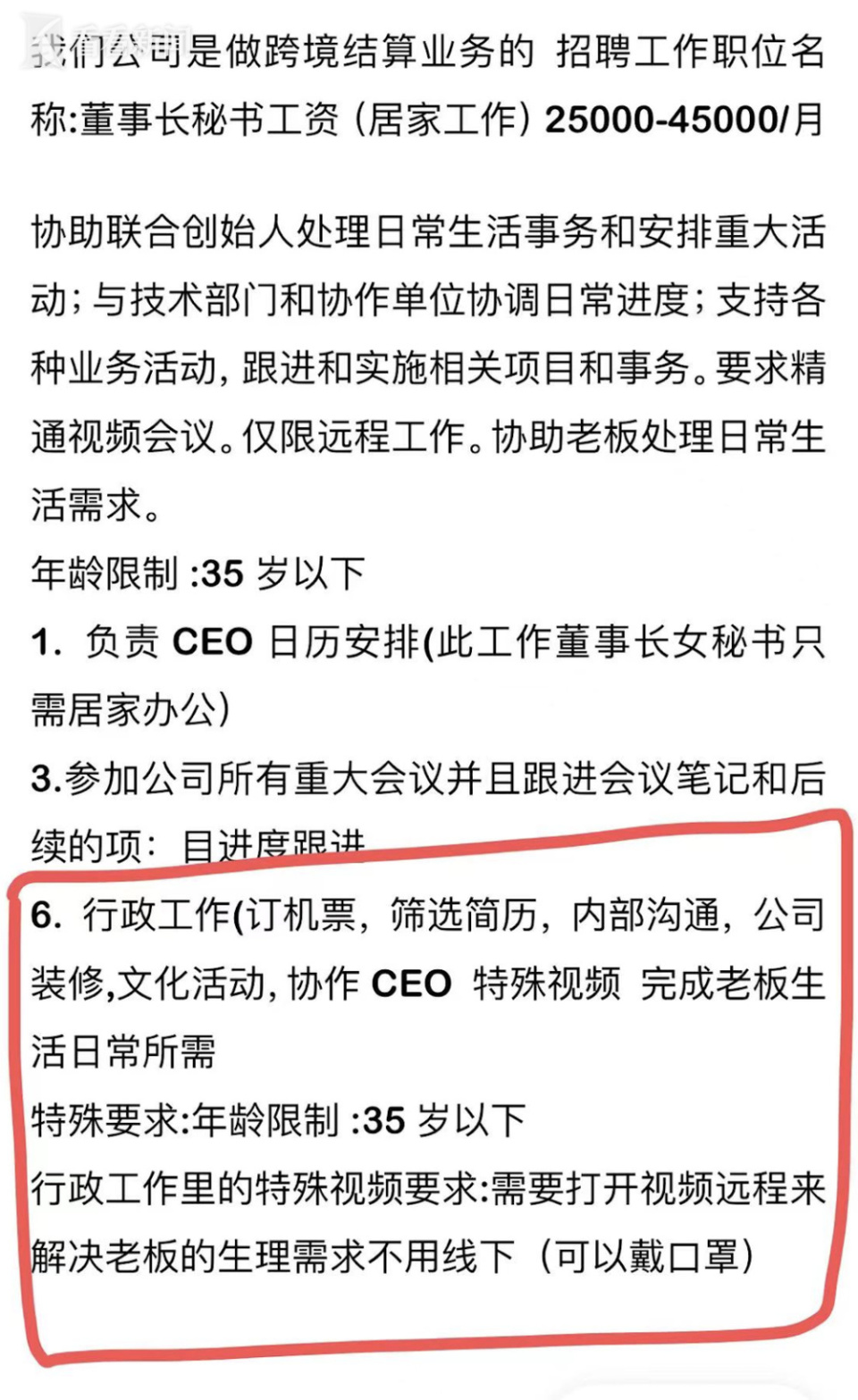 加上微信后,对方发来了一个文档,表示如果合适可以晚上细聊。文档中称该公司需招募线上女助理,年龄20-30岁的单身女性优先,月薪可达25000-45000,并称秘书“带点异性关系”“但只是用于线上”。点开附件“董事长秘书招聘要求”,正是网友截图爆料内容。