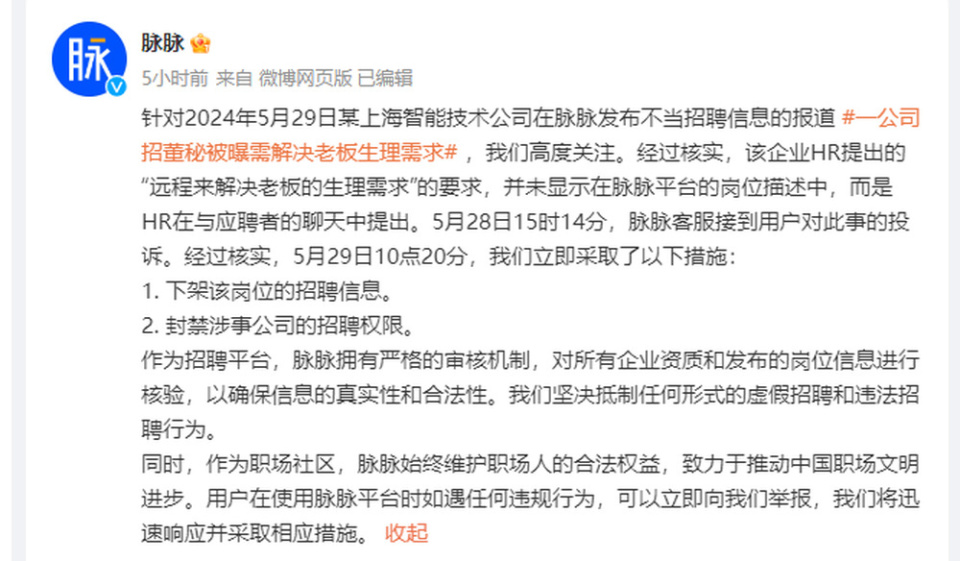 针对2024年5月29日某上海智能技术公司在脉脉发布不当招聘信息的报道 ,我们高度关注。经过核实,该企业HR提出的“远程来解决老板的生理需求”的要求,并未显示在脉脉平台的岗位描述中,而是HR在与应聘者的聊天中提出。5月28日15时14分,脉脉客服接到用户对此事的投诉。经过核实,5月29日10点20分,我们立即采取了以下措施: