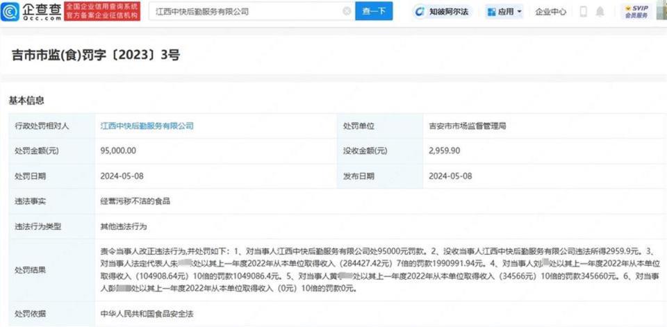 另据企查查APP显示,近日,“鼠头鸭脖”涉事企业江西中快后勤服务有限公司及相关责任人,因经营污秽不洁的食品再被处罚,处罚单位为吉安市市场监督管理局。