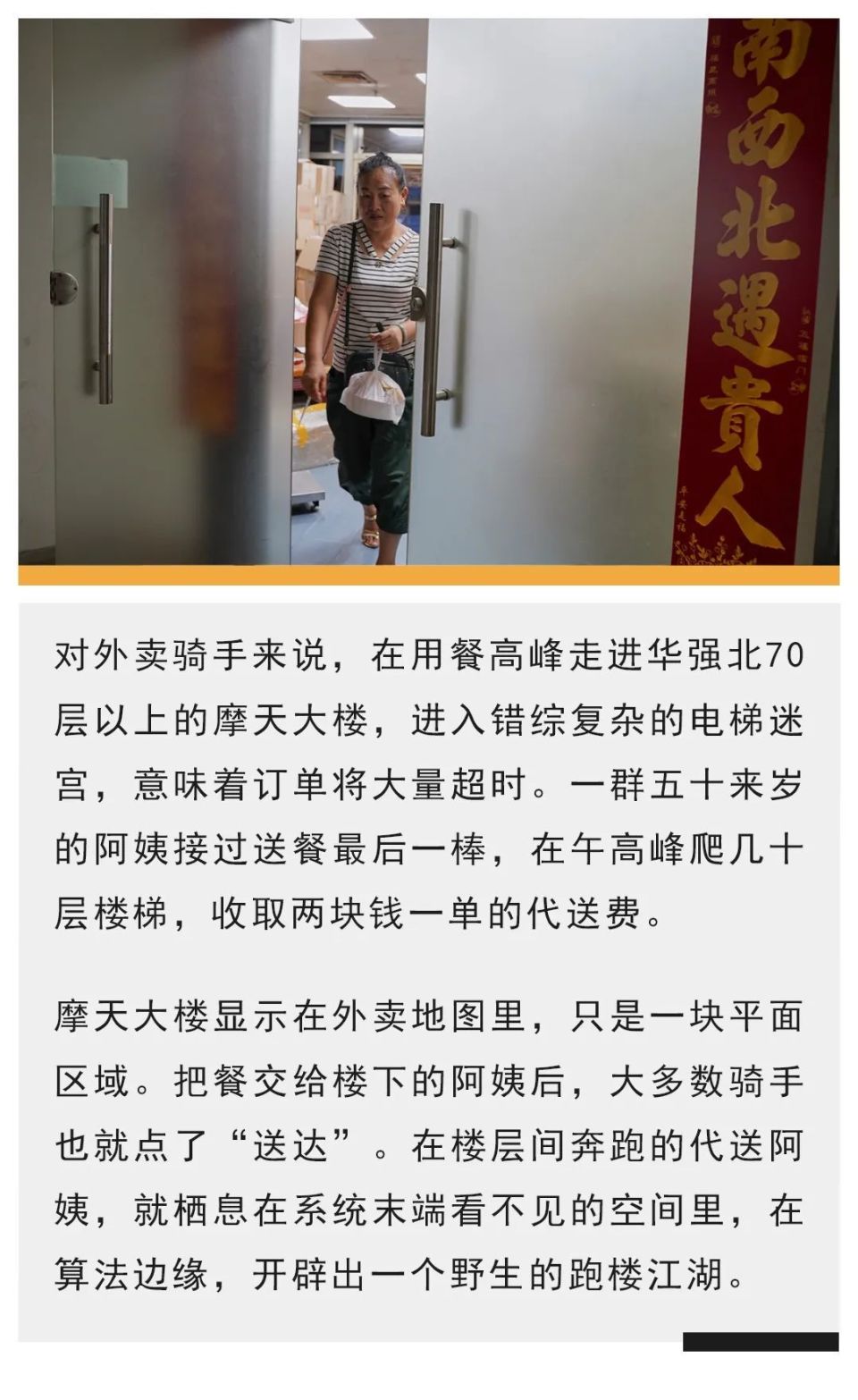 这钱只能阿姨挣,赛格广场的一位保安说,楼下不让停电动车,高峰时段送餐几乎没有其他选择。骑手间也有句话——没有跑楼阿姨,全都得“挂壁”,“午高峰电梯打死都上不去,一上一下时间耽误完,手里的单子一堆红(即将超时),就没法干了”。在华强北,他们随口就能报出二三十个有跑楼阿姨驻扎的大厦,赛格算是好赚的,代送半天能有百来块收入。