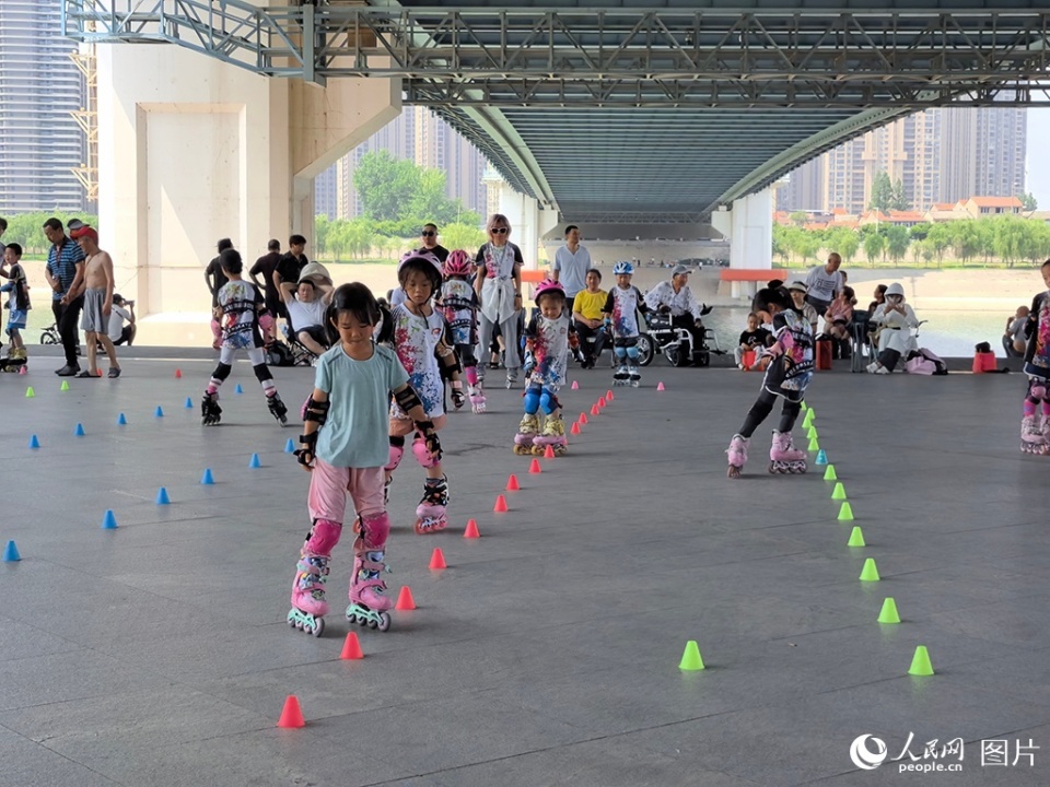 5月25日,儿童在湖北武汉市硚口区汉江湾体育公园练习滑轮。人民网记者 周雯摄