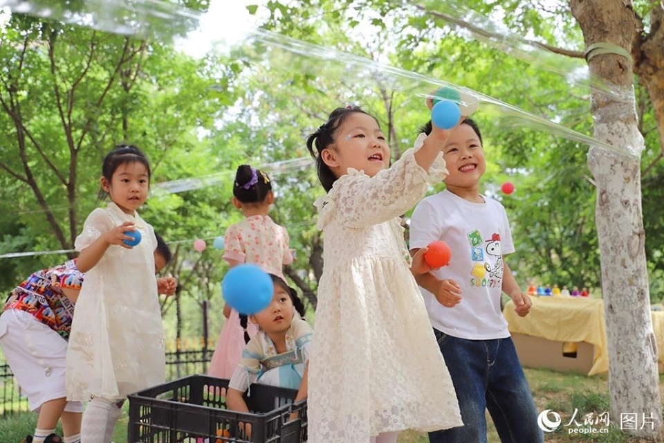 5月30日,在“六一”国际儿童节到来之际,山东济南市历下区百合幼儿园的孩子们在百游小院的“彩虹农场”里,感受难忘瞬间。人民网记者 刘祺摄