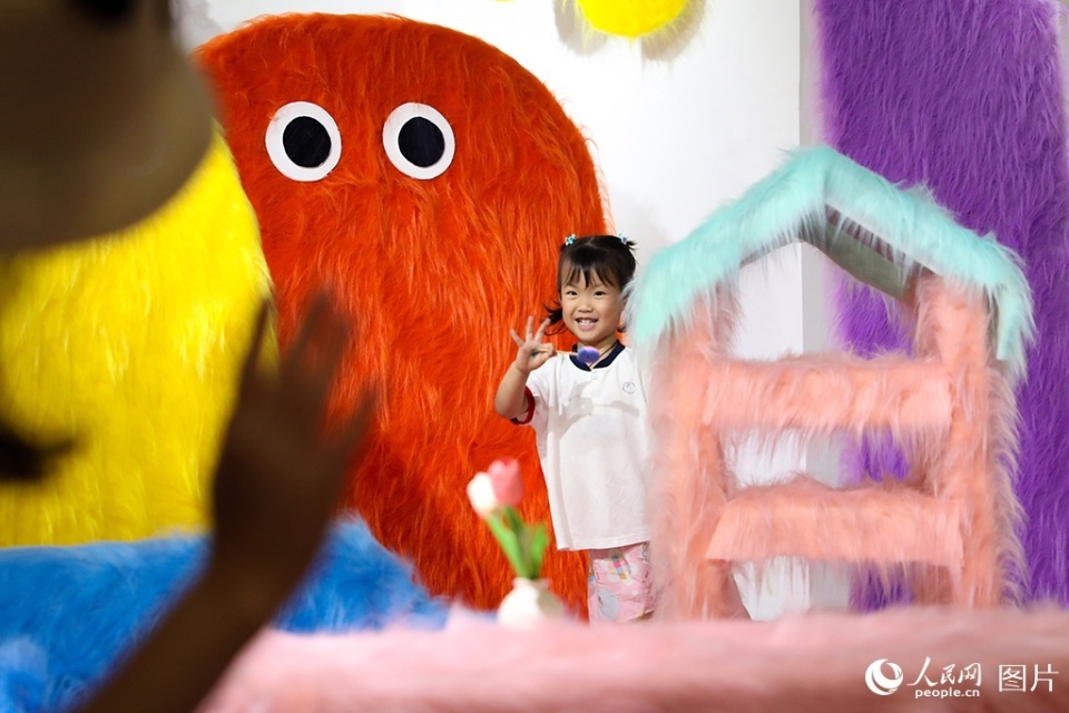 5月29日,河北雄安娃在“六一”艺术展上与家长互动。人民网记者 宋烨文摄