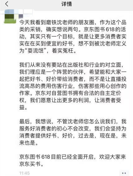 该朋友圈截图中提到,京东618活动目标是让消费者买到便宜的好书,否认站在出版社和行业对立面。回应中还提到,京东对自营图书有合法的自主定价权。?