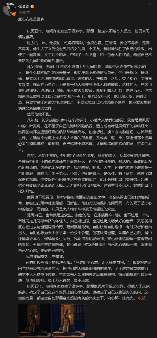 6月2日,张若昀发长文称,“感谢这些年一直有范闲陪着我,五年的等待与陪伴,我也像剧中范闲时时叩问自己内心选择一样,坚定着自己的心志,走好自己的路。”