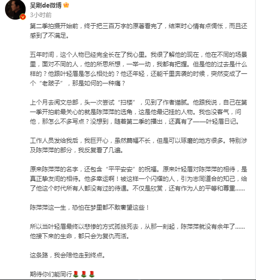 吴刚透露,当叶轻眉最终以悲惨的方式孤独死去,从那一刻起,陈萍萍就没有余年了。他接下来的生命,都只会为复仇而活。这条路,他会陪他走到终点,并希望观众也能同行。