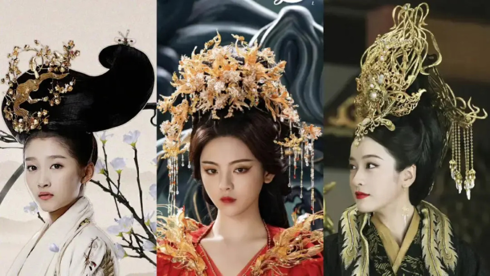 不同于其他造型需要一定花样的发型做“地基”,发冠类造型只需要梳个简单的发型,然后直接把发冠固定在头上即可。问题在于,有时候发冠的体积过于夸张,剧中角色也会因此喜提一座“违章建筑”。
