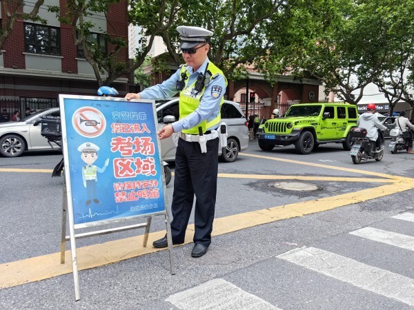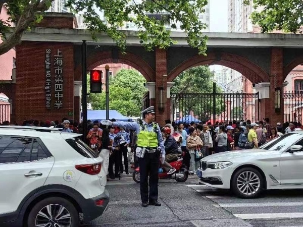 今天是高考首日。上午7时刚过,在位于徐汇区天钥桥路的市四中学考点门口,两名交警和三名辅警队员已上岗,沿途放置反光锥将机动车与非机动车道分隔开来,并在路边设置了禁止鸣号标牌。现场也照例设置了机动警力,一旦遇到考生求助,可以随时通过警用摩托车开道或驳运,确保高效处置突发情况。