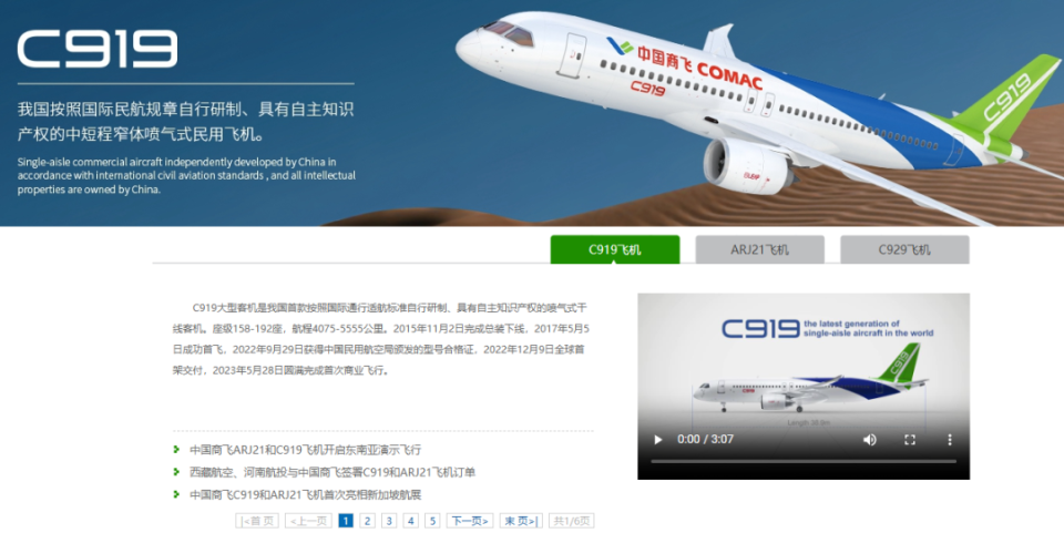 C919大型客机于2015年11月2日完成总装下线,2017年5月5日成功首飞,2022年9月29日获得中国民用航空局颁发的型号合格证,2022年12月9日全球首架交付,2023年5月28日圆满完成首次商业飞行。