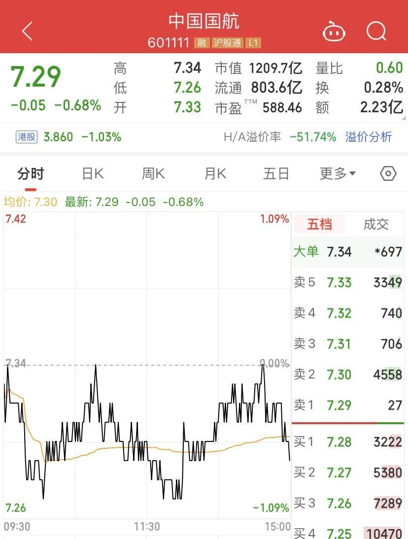 6月20日收盘,中国国航A股跌0.68%,收报7.29元,公司总市值为1210亿元。